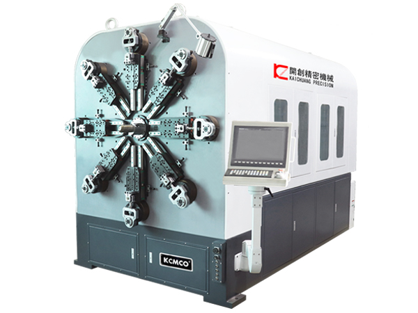 開創(chuàng)KCT-1260WZ十二軸無凸輪數(shù)控萬能彈簧轉(zhuǎn)線成形機利用臺灣Windows7操作控制系統(tǒng)、引用日本進口安川伺服電機,采用獨特的無凸輪和無搖臂設(shè)計,刀架由八組伺服馬達獨立控制,其中刀架八軸、送線一軸、轉(zhuǎn)芯一軸、轉(zhuǎn)線一軸和卷曲一軸,其統(tǒng)成由曲柄連桿成形系統(tǒng)、送線系統(tǒng)、轉(zhuǎn)線系統(tǒng)、校直系統(tǒng)和轉(zhuǎn)芯系統(tǒng)等組成。此外,該機型可配帶液壓剪刀裝置,切割噪音小,對芯棒及機器的損害為零;同時也極大的提升了彈簧加工范圍,不僅具有成形快、精度準(zhǔn)和性能穩(wěn)等特點,而且調(diào)機更方便,易操作。